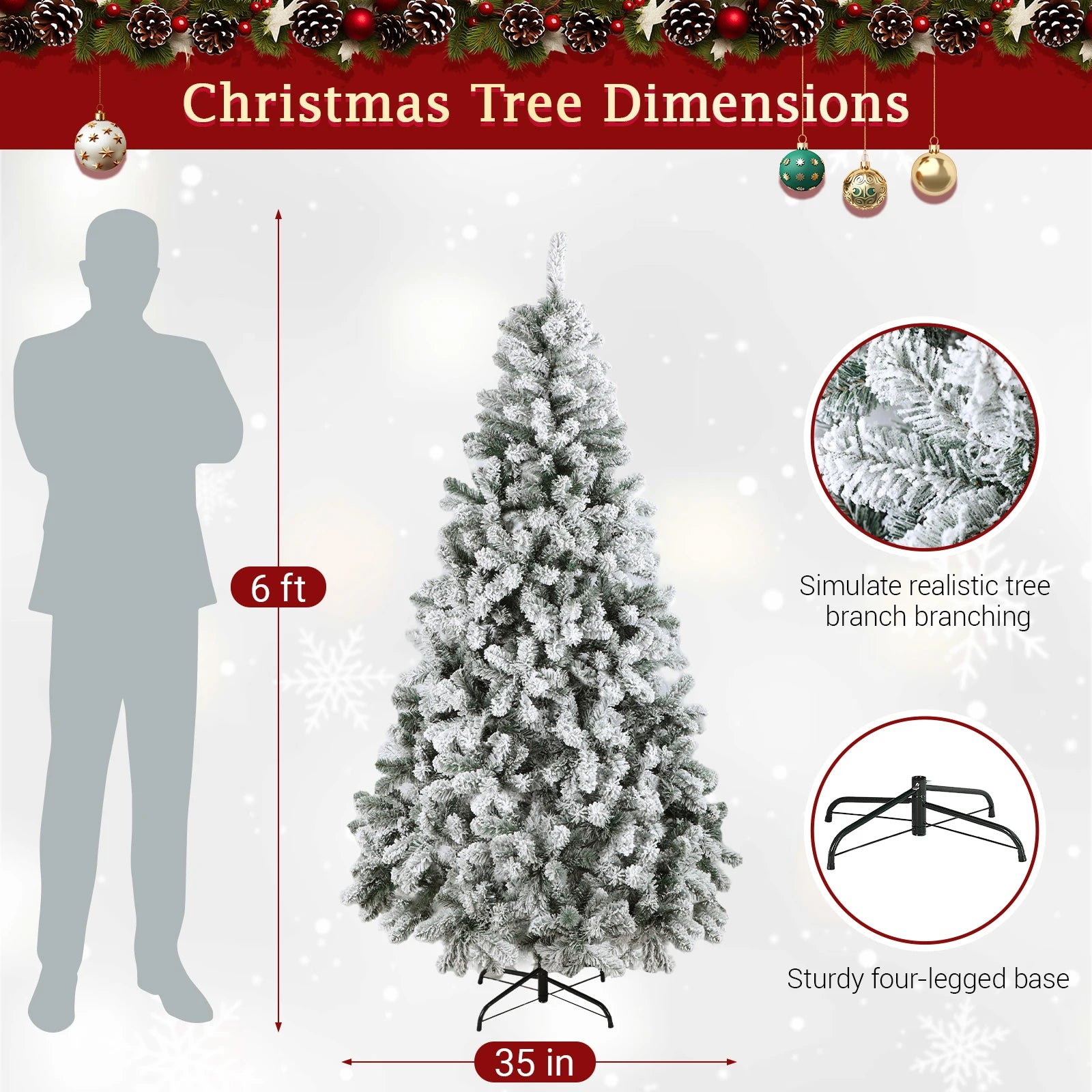 Bring holiday magic into your home with this beautifully designed flocked Christmas tree. Crafted with premium PVC branch tips, this artificial Christmas tree offers a full and realistic look, while the sturdy iron trunk and foldable metal stand keep it stable throughout the season.