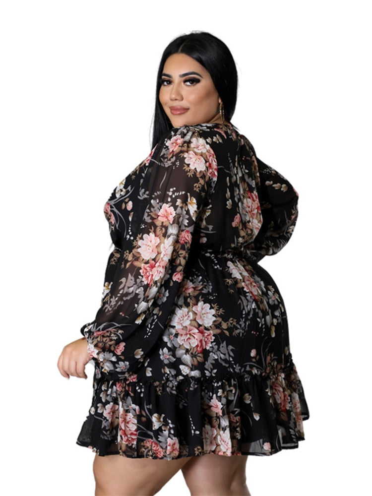 Plus Size Women Flower Print V Neck Out Long Sleeve Dress