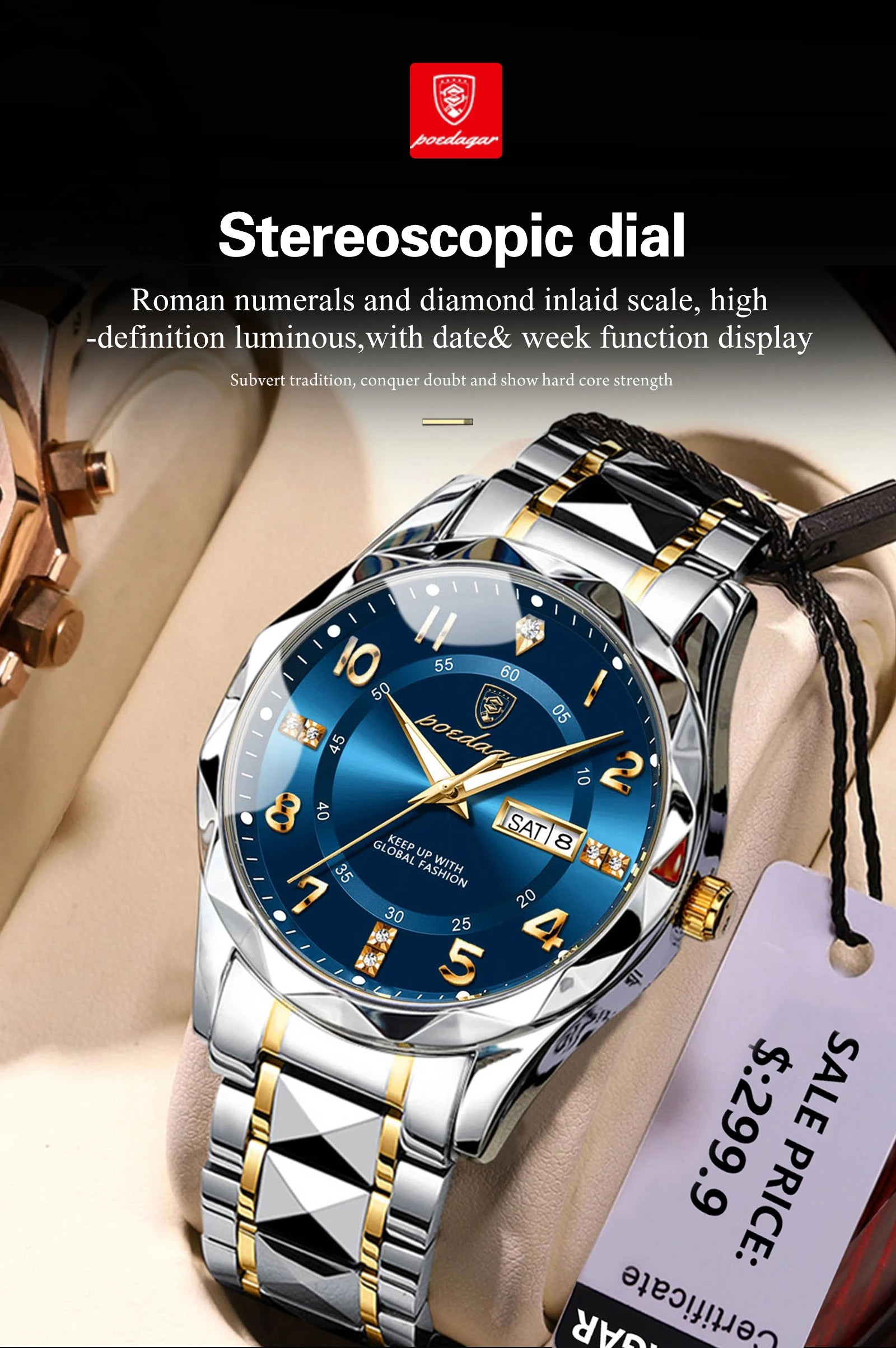 POEDAGAR Luxury Men Quartz Watch Waterproof Date Week Luminous Wristwatch